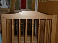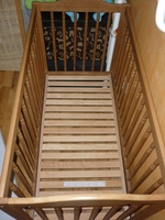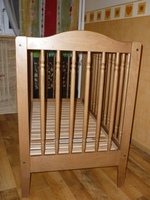 - Bükkfából készült antik pácolással, körben teljesen rácsos és a két végénél ívelt a faelem (a jelenleg kapható változatnál falap található a két végén, amin keresztül nem látszik a baba és nem szellőzik olyan jól, mint ez).